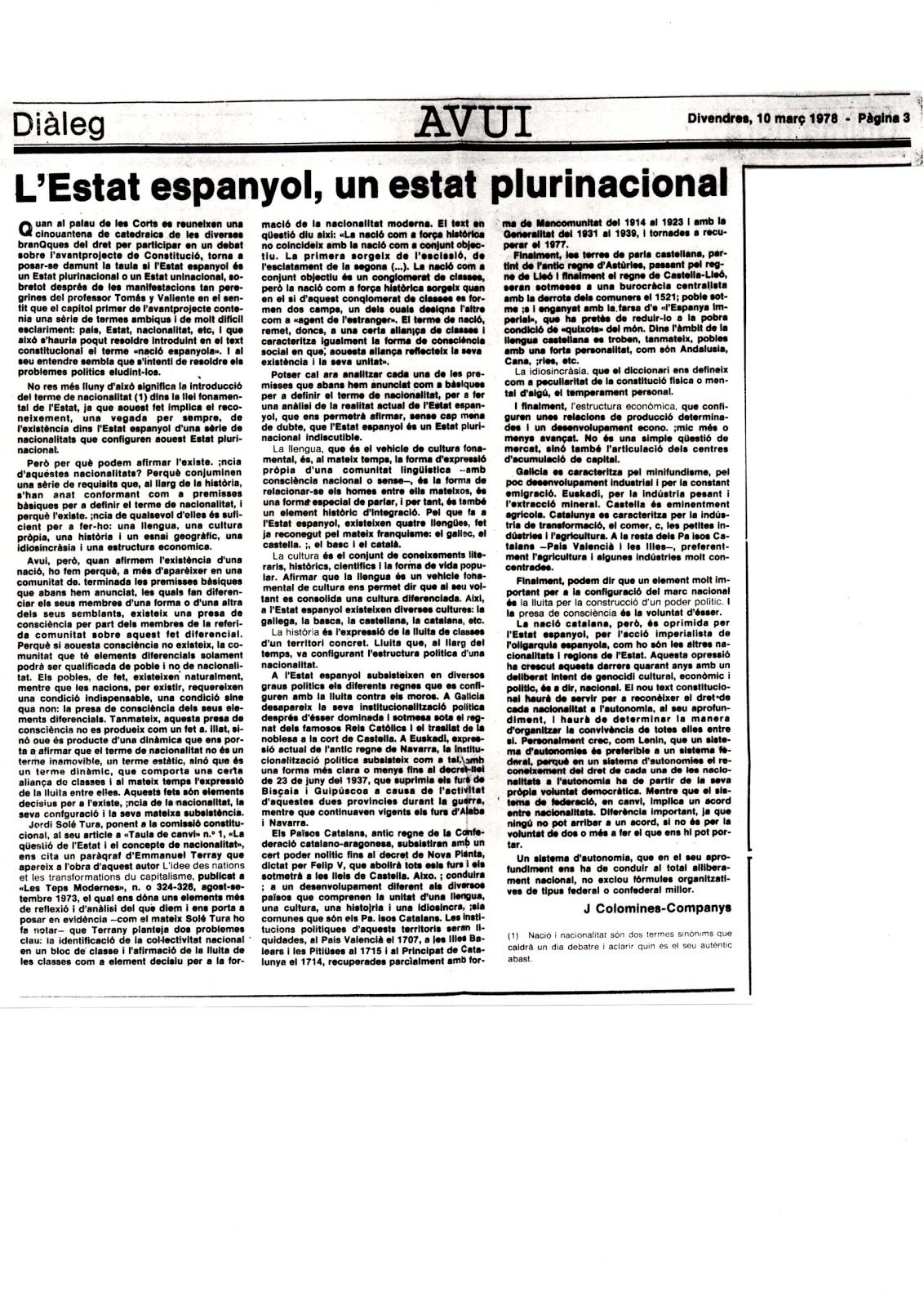 Però la realitat és tossuda i sense defallir, una i altra vegada ressorgeix buscant una sortida digna. Per aquest motiu crec que avui, de la mateixa manera que ho fèiem el 1978 ens cal continuar explicant perquè Catalunya és una nació i per tant subjecte jurídic sobirà. Podria escriure l’article publicat al Diari Avui el 10 de març de 1978 titulat: L’Estat espanyol, un estat plurinacional, però crec que no és necessari i per això el reprodueixo íntegrament a continuació. Mantinc, per tant, el llenguatge d’una època perquè, en fer-ho, crec que ajudarà a entendre el context en que es va aprovar la Constitució.