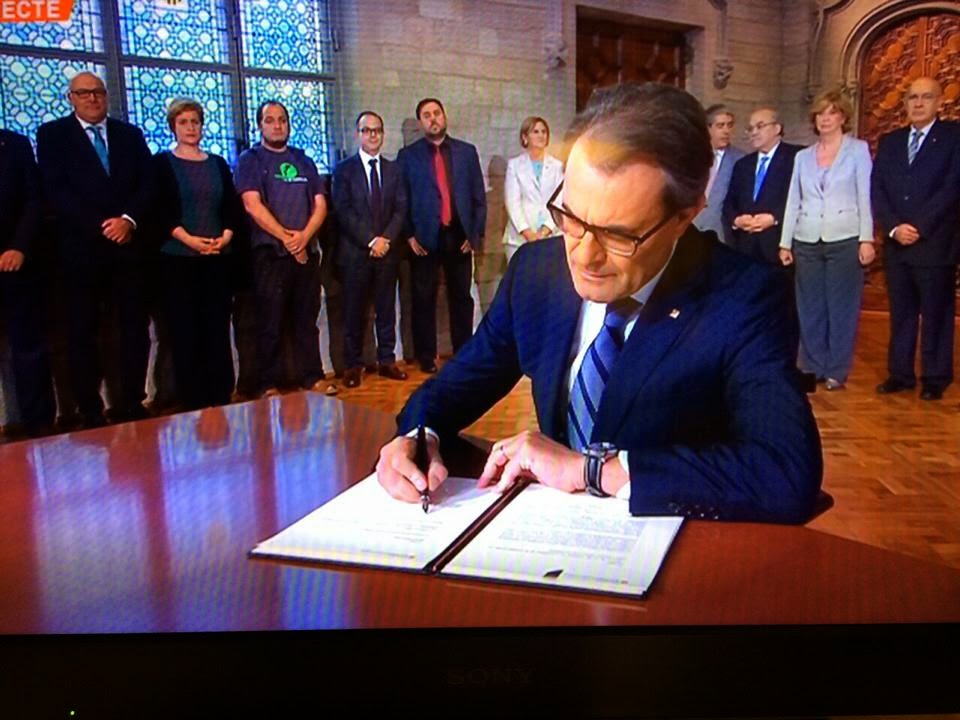 | Acte de signatura del decret 129/2014 de convocatòria de la consulta del 9 de novembre de 2014 el dia 27 de setembre de 2014 al Palau de la Generalitat. |