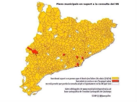 | Mapa dels 947 ajuntaments de Catalunya que han votat mocions a favor (920, grocs) o en contra (vermells) de la consulta del 9 de noviembre o no han fet res (blanc) |