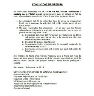 Text del comunicat de premsa fet per la Taula de les forces polítiques i socials per a l’Estat propi el passat 13 de març de 2015.